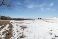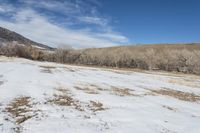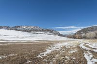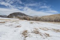 A low mountain covered in snow stands in the open grassy fields of Denver, Colorado, USA on a clear winter day.