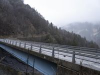 A gloomy winter day in the French Alps, showcasing the majestic mountain range covered in snow and surrounded by fog and wet roads.