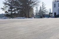 A snowy road surface in Ontario, Canada, leading to a residential property with open space and trees on a clear winter day.