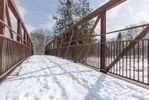 A snow-covered road in Ontario, Canada, during a winter day. The straight path leads through a suburban area, with trees lining the thoroughfare. The freezing temperatures have created a frosty and icy infrastructure, with snowflakes falling from the cloudy sky. An Armco barrier and a bridge can be seen in the distance, providing safety on this off-road track.