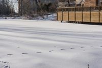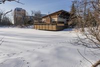 A beautiful winter landscape in Ontario, Canada, featuring a residential home surrounded by open spaces and trees covered in snow. The clear sky and sunlight create a frosty and peaceful atmosphere.
