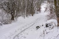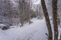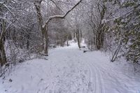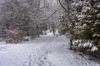 A gloomy winter morning in Ontario, Canada. The snow-covered forest creates a serene and peaceful atmosphere as the sun begins to rise, casting a soft light on the straight road through the woods.