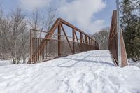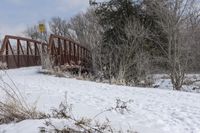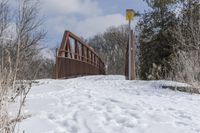 A scenic winter view of a residential area in Ontario, Canada, covered in snow. The straight road leads through the neighborhood, lined with houses and trees. A wooden bridge with an Armco barrier can be seen in the distance, surrounded by frozen vegetation and a snowy landscape.