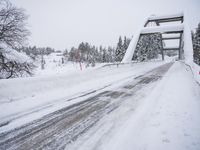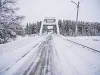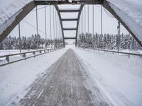 A scenic winter landscape in Sweden, with a straight road covered in snow leading to a suspension bridge over a frozen river.