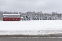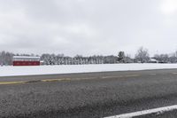 A scenic winter landscape in Uxbridge, Ontario, Canada, featuring a snow-covered road lined with trees and a red barn in the distance under a grey sky.