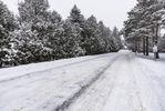 A scenic view of a snowy landscape with trees and a winding road on a cold winter day under a clear sky