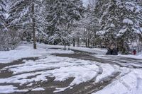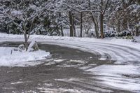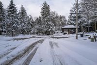 A gloomy winter morning in a residential neighborhood in Ontario, Canada. The road stretches straight ahead, covered in asphalt and surrounded by snow-covered trees and houses. The grey sky adds to the gloom of the landscape.
