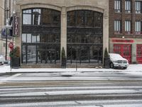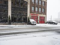 A crosswalk in Detroit, USA, filled with motor vehicles and classic architecture on a cold winter day. The brick wall and residential buildings create a profile of the metropolitan area's infrastructure and public space.