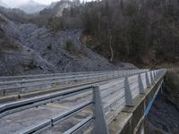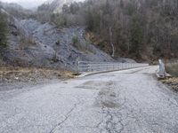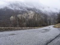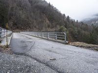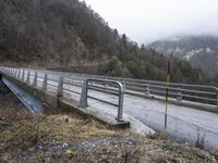 Scenic view of a snow-covered mountain pass in the French Alps with a concrete bridge and a road surrounded by trees and fog