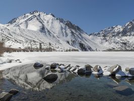 A breathtaking view of the snow-capped mountain range on a clear winter day, surrounded by open, glacial wilderness and icy trees.