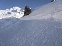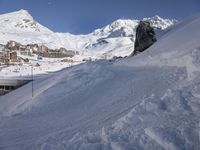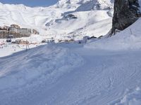 A gondola overlooks a snow-covered piste in the Moraine Massif of France. The Nunatak and arête are surrounded by a winter mountain landscape of icy terrain and glacial valleys, providing an ideal backdrop for skiing, snow sports, and tourist attractions.