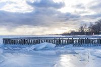 A serene winter reflection of a coastal pier on a cold day, with the icy sea and snowy shore in the background.