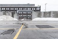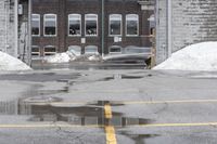 A monochrome photo showcasing the reflection of buildings in a wet parking lot in Toronto, Ontario, Canada.