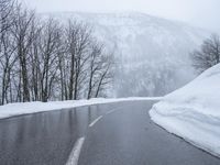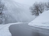 A foggy and snowy day in the French Alps. The road covered in snow and ice, surrounded by trees and mountains.