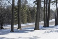 A high, rural road covered in snow winds through a residential area in Ontario, Canada, with tall trees lining the path and casting long shadows on the asphalt.
