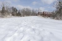 A straight road in Ontario, Canada, covered in snow during a blizzard, with tree-lined suburban landscape and Armco barriers.