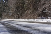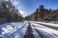 A straight road covered in snow leads through a beautiful forest in Ontario, Canada under a clear blue sky. The sunlight filters through the branches of the evergreen trees, creating a picturesque winter landscape.
