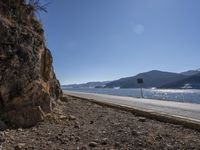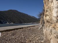 A winding road along Yunnan's rugged coastline in Shangri-La, China, with mountains, trees, reservoirs, lakes, rock walls, vegetation, soil, and sea in the foreground and a mountain range in the background. A natural environment of highlands, wadis, beaches, valleys, and fjords are visible, with a winter cloud sound in the distance.