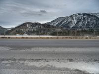 A view of a wet and snowy asphalt road and bridge with a mountain and nature landscape in the background, illuminated by a cloudy winter's day in rural Germany, Europe.