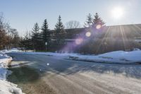 A snowy residential area in Ontario, with a clear sky and winter trees. The asphalt road and infrastructure blend harmoniously with the suburban homes, creating a picturesque scene of real estate in the freezing winter. The sunlight casts long shadows on the snow-covered ground, while a river flows peacefully in the background.