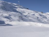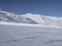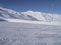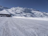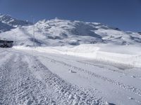 A picturesque view of a parking lot in the French Alps, surrounded by a mountain range of Nunatak, Piste, and Glaciers, on a clear day with the sun shining brightly.