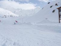 A snow-covered landscape in the French Alps provides a stunning winter tourist attraction. Open space, mountains, and a clear sky with the sun's sunshine visible in the surface make this a prime skiing destination in Europe.