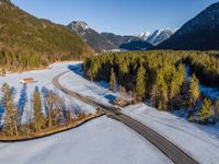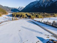 The snow-covered landscape of Germany is visible from an elevated, aerial view, with a winding road cutting through the open space and providing a profile of the rural, mountainous terrain.