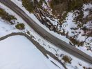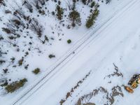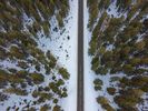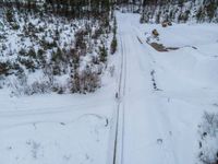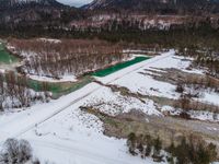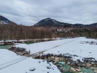 An elevated view of a rural winter landscape in Germany, showing a road winding through a forest and open space covered in snow. Rivers and mountains can be seen in the distance, from a one-quarter profile, top-down position.