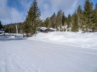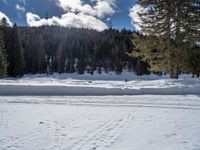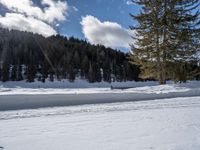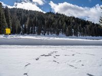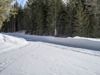 A high, one quarter, aerial view of a winding road through a forest in rural Germany, with snow-covered mountains, a clear sky, and a wet surface. This top down view provides an elevated perspective of the wintery landscape.