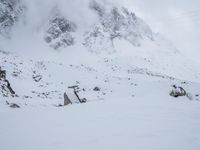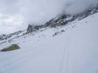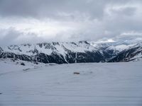 Gazing out from the Aiguille du Midi in the French Alps, an open landscape of snow and mountain peaks is seen in the gloomy winter light. A gondola track and footsteps in the snow are evidence of visitors to this scenic overlook.