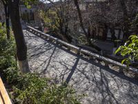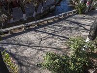 A residential area in the old town of Lijiang, Yunnan, China, is seen from a top down view. The classic architecture and cobble stone roads are surrounded by a natural environment of trees, vegetation, and a clear sky. The road surface, a bridge, and a hotel are visible in the foreground, while a river, forest, and a creek can be seen in the background.