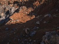A top-down view of an off road track winding through the Yunnan province of China. The landscape is characterized by its rocky mountain landforms, wild open spaces, and Mars-like terrain, all in a sunny and clear sky setting.