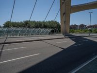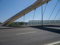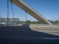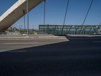 In the vibrant city of Zaragoza, Spain, a modern bridge stands as a testament to contemporary architecture and urban design. The bridge's sleek profile and clean lines are highlighted by the clear blue sky above. As the sun casts its rays, the bridge casts a hard shadow on the road below, creating a striking visual contrast. This urban landscape captures the essence of city life in Europe, where modernity and tradition coexist in harmony.