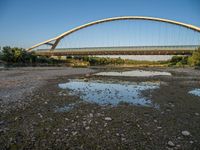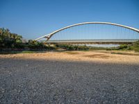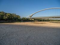 In the heart of Zaragoza, Spain, a modern bridge spans the river, offering stunning views of the city. The bridge's sleek architecture and open spaces are complemented by the clear sky, creating a picturesque scene. Surrounding the bridge, there are dirt and gravel areas that add to the urban charm. As the sun rises, the break of day illuminates the water and highlights the underpass beneath the bridge. Experience the beauty of Zaragoza's architecture and natural landscape in this captivating setting.