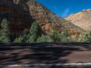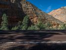 In the heart of Utah, USA, lies the breathtaking Zion National Park. A winding road stretches through the picturesque landscape, framed by majestic mountains and under a clear blue sky. The asphalt road leads visitors on a journey through nature's wonders, with the sun shining brightly overhead. The stunning scenery offers a quarter mile of pure bliss, with clear skies and fluffy clouds adding to the beauty. Explore the splendor of Zion National Park and experience the magic of this natural treasure.
